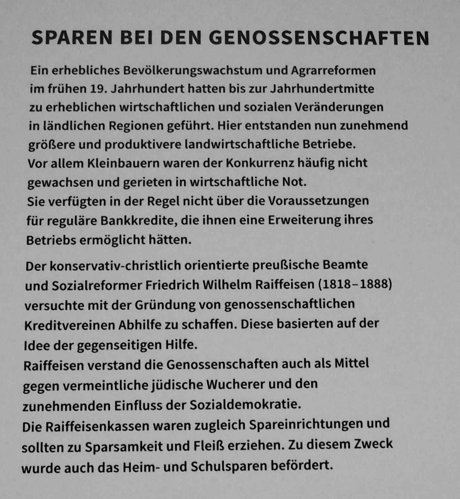 Die Ausstellung bietet eine Reise durch die Zeit, der Entstehung der ersten Sparverbände, der Sparkassen, Raiffeisenbanken, die Entstehung des Sparens und der schon immer nationalistischen Konnotation des Sparens.
