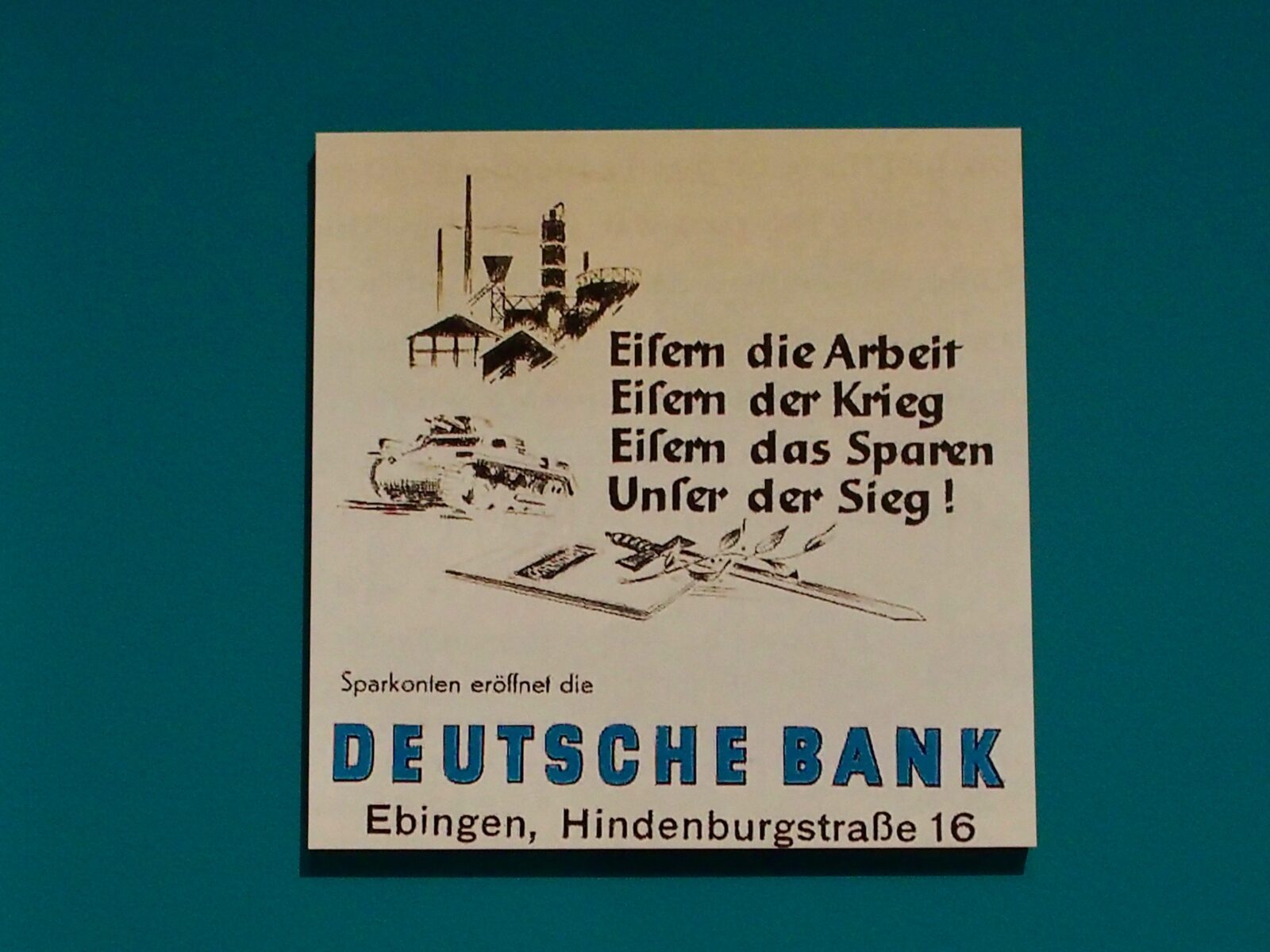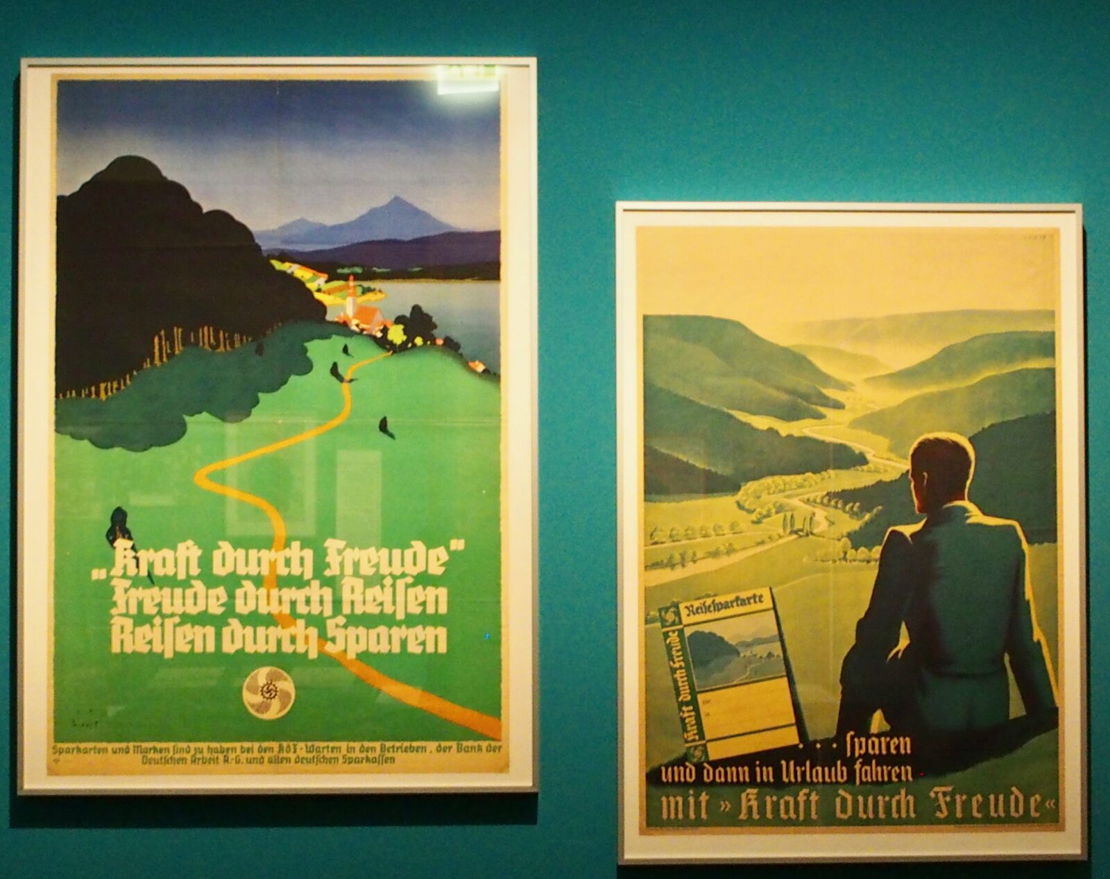 Die Reise geht weiter zu Begriffen wie „Brechung der Zinsknechtschaft“, Sparen für den KdF-Wagen oder die KdF-Reise. Letztere sind um die wohl makabersten Objekte der Ausstellung gegliedert, einer Sparkarte für Ostarbeiter*innen, die so zu mehr Leistung motiviert werden sollten und einer Sparkarte des Ghettos Theresienstadt, die für die Delegation des Roten Kreuzes dort erfunden wurde, um eine heile Welt darzustellen. Heile Welt im nationalsozialistischem Sinne heißt eben auch Sparen.
